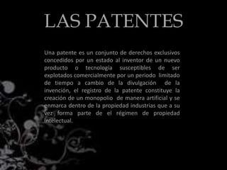 Una patente es un conjunto de derechos exclusivos concedidos por un estado al inventor de un nuevo producto o tecnología por un periodo limitado a cambio de divulgar la invención. Esto crea un monopolio artificial y forma parte de la propiedad industrial. Algunos beneficios de patentar un invento incluyen reconocimiento, recompensas materiales, el derecho a decidir quién puede usar la invención y impedir que los competidores la copien. La legislación vigente en materia de patentes en Colombia incluye la Decisión 486 de 2000 de la