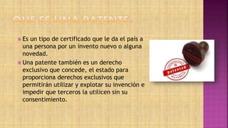 Una patente es un certificado otorgado por un país por un invento nuevo que otorga derechos exclusivos sobre la invención e impide que terceros la utilicen sin consentimiento. Las patentes otorgan una ventaja competitiva y son un activo intangible importante. El Tratado de Cooperación en Materia de Patentes simplifica el proceso de solicitud de patentes permitiendo una solicitud única en varios países. Algunas invenciones colombianas patentadas incluyen un vibrador para sordos, un marcapasos externo con electrodos internos, y