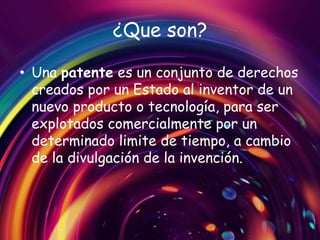 Una patente es un derecho otorgado por el estado al inventor de un nuevo producto o tecnología, que permite su explotación comercial exclusiva por un tiempo limitado. Patentar proporciona beneficios como reconocimiento estatal, mayor facilidad de comercialización y una ventaja competitiva. Se presentan ejemplos de inventos colombianos patentados, como un vehículo solar, audífonos indestructibles, un microscopio de alta definición, un sistema de reutilización de agua y un robot para detectar minas antipersonas.