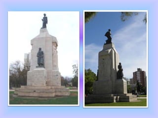 El documento presenta información sobre varios monumentos y características de la Plaza Rivadavia en Bahía Blanca, Argentina. Describe los monumentos a Rivadavia, los ingleses, Caronti y la comunidad israelita que se encuentran en la plaza, así como su diseño y ubicación original. También menciona a los fundadores homenajeados por estos monumentos.