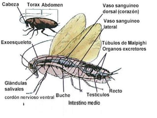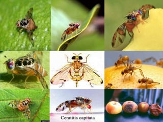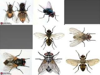 Las cucarachas y las moscas son insectos que se alimentan de restos de comida y materia orgánica en descomposición. Las cucarachas más comunes incluyen la cucaracha alemana, australiana, café y cubana, mientras que las moscas incluyen la mosca doméstica y las moscas de la fruta como la mosca del olivo. Estos insectos prosperan en ambientes húmedos, cálidos y sucios y pueden transmitir enfermedades a los humanos.