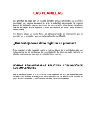 El documento trata sobre las planillas de pago. Explica que las planillas son registros contables que demuestran la relación laboral entre un trabajador y una empresa, incluyendo la remuneración y beneficios. También establece que los empleadores deben registrar a todos los trabajadores sujetos al régimen laboral privado, independientemente del tipo de contrato, y deben llevar las planillas de forma física autorizada por la autoridad competente. Por último, indica que las planillas deben incluir datos como los nombres de los trabajadores, sus rem