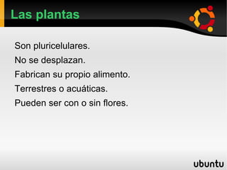 Este documento habla sobre las plantas. Explica que las plantas son pluricelulares, fabrican su propio alimento a través de la fotosíntesis y pueden ser terrestres o acuáticas. Describe las partes principales de la planta como la raíz, tallo y hojas. También distingue entre plantas con flores y sin flores, y entre árboles, arbustos y hierbas. Finalmente, resume brevemente los procesos de nutrición, fotosíntesis y reproducción en plantas.