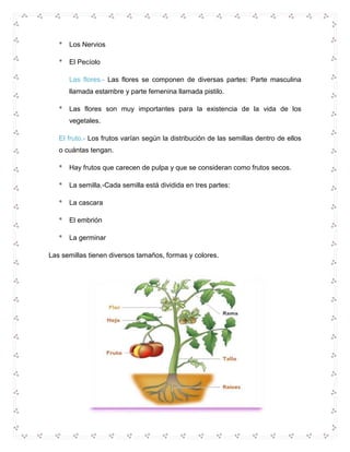 Las plantas son seres vivos capaces de realizar la fotosíntesis para producir su propio alimento a partir de sustancias inorgánicas con la ayuda de la energía solar. Presentan partes como raíces, tallo, hojas, flores y frutos, cada una con funciones importantes como la absorción de agua y nutrientes del suelo, el transporte de agua y alimento por la planta, la producción de alimento, y la reproducción.