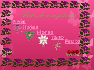 Este documento describe las principales partes de una planta, incluyendo la raíz, la flor y el fruto. La raíz fija la planta en el suelo y absorbe agua y nutrientes. La flor es la estructura reproductiva que produce semillas a través de la reproducción sexual. El fruto protege y transporta las semillas maduras.
