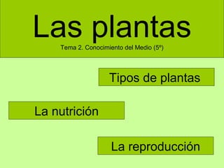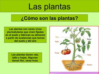 Este documento presenta información sobre las plantas. Explica que las plantas se dividen en tres tipos principales (hierbas, arbustos y árboles) y dos grupos generales (plantas sin flores y con flores). Describe los procesos de nutrición, reproducción y polinización de las plantas, incluyendo la fotosíntesis, la absorción de agua y minerales, y la formación y dispersión del polen.