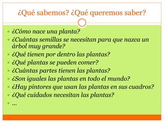 Este documento describe un proyecto de 7 semanas sobre las plantas para alumnos de 2o primaria. El proyecto incluye una exposición a la comunidad educativa sobre las partes de las plantas, experimentos sobre el crecimiento de las plantas y su búsqueda de la luz, y la elaboración y presentación de colonia. Los estudiantes también exploran el arte y las plantas a través de la obra de Van Gogh y crean sus propios cuadros, y estudian las rutas de transporte de los productos agrícolas típicos de