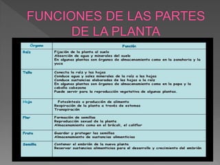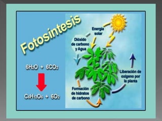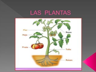 Las plantas son seres vivos porque nacen, crecen, se alimentan, se reproducen y mueren. Crecen en altura durante toda su vida a diferencia de los animales y se reproducen produciendo muchas semillas de las cuales nacen nuevas plantas. La fotosíntesis es el proceso mediante el cual las plantas transforman el dióxido de carbono, agua y minerales en carbohidratos utilizando la luz solar.