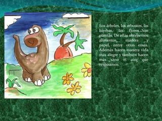 Las plantas incluyen árboles, arbustos, hierbas y flores, y proporcionan alimentos, madera, papel y oxígeno. Sus principales partes son la raíz, que absorbe agua y minerales del suelo, el tallo, que transporta sustancias, y las hojas, donde producen su alimento mediante la fotosíntesis con la ayuda de agua, minerales, aire y luz solar. Las plantas se reproducen a través de semillas y, en algunos casos, esquejes.