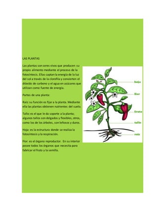 Las plantas producen su propio alimento mediante el proceso de fotosíntesis, en el que captan la energía del sol a través de la clorofila y convierten el dióxido de carbono y el agua en azúcares. Las plantas tienen raíces para fijarse al suelo y obtener nutrientes, tallos que les dan soporte, hojas donde ocurre la fotosíntesis, y flores que son sus órganos reproductores.