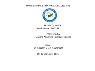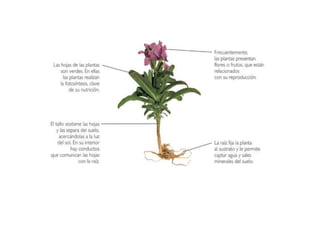 Este documento presenta las partes y funciones principales de las plantas. Describe las tres partes fundamentales de las plantas: la raíz, que absorbe agua y minerales; el tallo, que transporta savia; y las hojas, que realizan la fotosíntesis y la respiración. También cubre las flores y los frutos, explicando sus partes y funciones en la reproducción de las plantas.