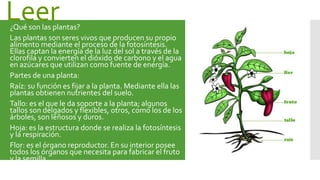 Las plantas son seres vivos que producen su propio alimento mediante la fotosíntesis. Están compuestas de raíces, tallo, hojas y flores. Se clasifican en plantas sin flor como helechos y plantas con flor como árboles, según la presencia de órganos como flores y frutos.