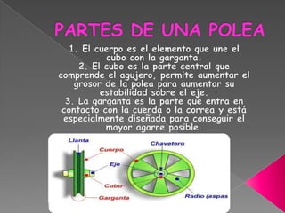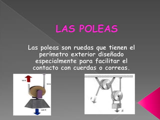 El documento describe el polipasto, que puede usarse como polea fija, móvil o combinación de ambas para elevar cargas mediante ganancia mecánica. Un polipasto consta de poleas fijas y móviles conectadas por una cuerda, donde las fijas cambian la dirección de fuerza y las móviles proporcionan ganancia según el número y combinación de poleas.