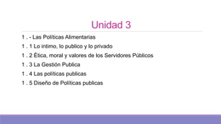 El documento aborda la relación entre lo íntimo, lo privado y lo público en el contexto de la ética y la moral en la gestión pública, resaltando la importancia de un servicio profesional de carrera en México. Se discuten las políticas alimentarias, la gestión pública y el diseño de políticas públicas, enfatizando la necesidad de transparencia y valores éticos en los servidores públicos. Además, se menciona el ciclo de vida de las políticas públicas y cómo abordar problemas públicos mediante un proceso estructurado de diagnóstico y análisis.