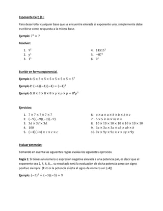 Este documento presenta conceptos y ejercicios sobre potencias. Explica qué son las potencias y cómo se representan, incluyendo ejemplos. Luego presenta diferentes tipos de ejercicios sobre potencias para que los estudiantes practiquen conceptos como el exponente cero, uno y negativo, así como la evaluación y conversión de expresiones con potencias.