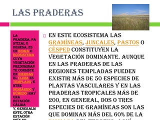 Este documento describe dos ecosistemas: las praderas y los chaparrales. Las praderas se caracterizan por estar dominadas por gramíneas, juncos y pastos. Su clima es templado a semiárido. Los chaparrales son arbustales densos que se encuentran principalmente en California y noroeste de México, con un clima mediterráneo de inviernos húmedos y veranos secos. Ambos ecosistemas albergan una gran diversidad de flora y fauna adaptadas a sus condiciones.