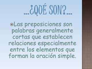 Este documento describe las preposiciones en español. Explica que las preposiciones establecen relaciones entre elementos de la oración y dan ejemplos como "a", "de", "en", "con". También indica que las preposiciones conectan sustantivos, pronombres, adverbios e infinitivos. Finalmente, señala que las preposiciones son necesarias para completar el significado de palabras como verbos y que un elemento puede regir varias preposiciones dependiendo de lo que se quiere expresar.