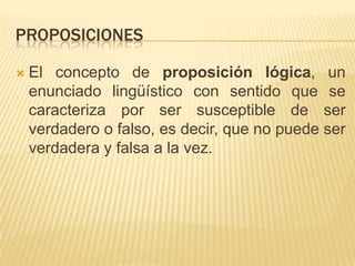 La proposición lógica es un enunciado lingüístico con sentido que puede ser verdadero o falso pero no ambos a la vez. Las proposiciones pueden ser simples u compuestas; las proposiciones simples son afirmaciones claramente definidas con un valor de certidumbre que no contienen conectivos lógicos, mientras que las proposiciones compuestas constan de dos o más proposiciones simples unidas por conectivos lógicos.