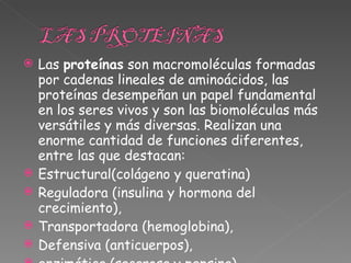 Las proteínas son macromoléculas formadas por cadenas de aminoácidos que desempeñan funciones estructurales, reguladoras, de transporte, defensivas y enzimáticas en los seres vivos. Están constituidas por la repetición de unidades simples llamadas monómeros. Su síntesis es un proceso complejo dirigido por los genes que producen numerosos compuestos al hidrolizarse.