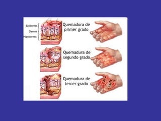 Este documento describe los diferentes tipos de quemaduras, incluyendo quemaduras de primer, segundo, tercer y cuarto grado. Explica que las quemaduras de primer grado solo afectan la capa superficial de la piel, mientras que las de segundo grado penetran más profundamente causando ampollas. Las quemaduras de tercer grado destruyen todo el espesor de la piel, y las de cuarto grado causan daños a los músculos y huesos. El tratamiento inicial para todas las quemaduras incluye enfriar la zona
