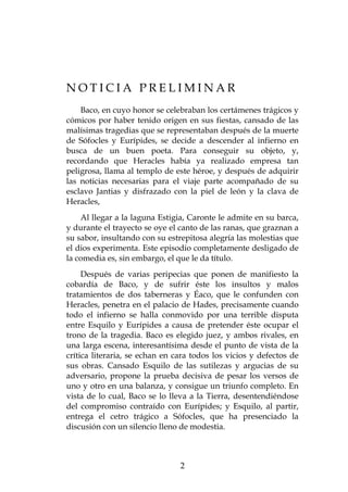 Baco desea encontrar un buen poeta trágico y planea viajar al inframundo para traer de regreso a Eurípides. Para ello, visita al héroe Heracles para pedirle consejo sobre cómo realizar el peligroso viaje a los infiernos. Heracles se burla del disfraz de Baco y duda de sus afirmaciones sobre haber participado en una batalla naval. Aun así, Baco insiste en que necesita traer de vuelta a Eurípides para mejorar la calidad de las tragedias que se presentan en sus festivales