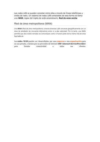 Este documento describe tres tipos de redes: redes WAN, que conectan LAN a través de líneas telefónicas u ondas de radio; redes MAN, que conectan LAN cercanas geográficamente dentro de un área de 50 km; y redes WAN que pueden ser desarrolladas por empresas privadas o proveedores de internet para brindar conectividad a clientes.