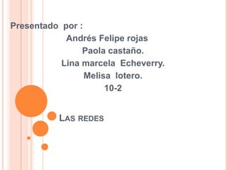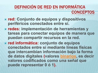 Este documento presenta información sobre las redes. Define redes como conjuntos de equipos conectados que comparten recursos. Explica que las redes son importantes para compartir archivos, comunicarse y acceder a información de manera universal. Describe similitudes entre tipos de redes como servidores, clientes, medios de conexión y recursos compartidos. Incluye diagramas mostrando cómo funcionan sistemas de red.