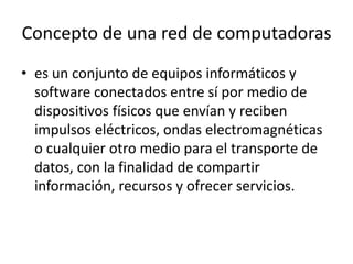 El documento describe los conceptos básicos de una red de computadoras, incluyendo que una red es un conjunto de equipos conectados que comparten información y recursos, y los elementos clave que forman una red como computadoras, tarjetas de red, cables, sistemas operativos y concentradores. Además, proporciona los datos personales del autor.