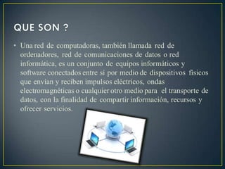 Este documento describe varios tipos de redes de computadoras, incluyendo redes de área local (LAN), redes de área amplia (WAN), topologías de red como estrella, bus y anillo, y dispositivos de red como switches, routers y firewalls. También define protocolos de red comunes como TCP/IP, IPX/SPX y AppleTalk.