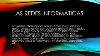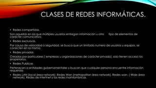 Las redes informáticas conectan múltiples ordenadores y comparten recursos como software, archivos e impresoras. Existen diferentes tipos de redes como redes compartidas para múltiples usuarios, redes exclusivas con acceso limitado, redes privadas solo para una empresa u organización y redes públicas para que cualquier persona encuentre información. También hay diferentes escalas de redes como las redes locales (LAN), metropolitanas (MAN) y de área amplia (WAN) e incluso redes inalámbricas.