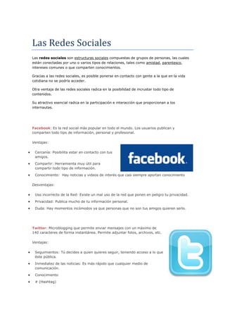 Este documento describe varias redes sociales populares, incluyendo sus ventajas y desventajas. Habla sobre cómo Facebook, Twitter, Flickr, YouTube y LinkedIn permiten compartir fotos, videos, actualizaciones y conexiones personales y profesionales.