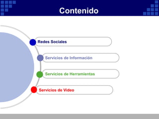 Este documento describe varios servicios de redes sociales, incluyendo MySpace, Facebook, Blogger, Fotolog y Twitter. También cubre servicios de información como Wikipedia, servicios de herramientas como ThinkFree, Zoho y Picasa, y servicios de video como YouTube. El documento explica brevemente cada uno y proporciona enlaces a sitios web con más información.