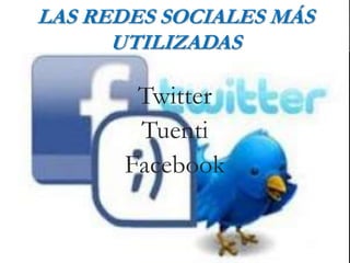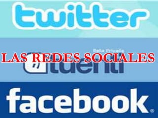 Twitter es un servicio de microblogging que permite enviar mensajes cortos de hasta 140 caracteres llamados tuits. Se creó en 2006 y rápidamente ganó popularidad. Tuenti es una red social española que ofrece servicios como mensajes privados y chats. Facebook fue fundada en 2004 por Mark Zuckerberg como una red para estudiantes de Harvard y ahora permite a cualquier persona con correo electrónico unirse. Ofrece funciones como lista de amigos, grupos, fotos y botón de "Me gusta".