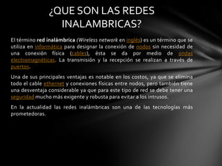 Este documento describe las redes inalámbricas, que permiten la conexión de nodos sin cables mediante ondas electromagnéticas. Menciona que una ventaja es la reducción de costos al eliminar cables, pero existe el desafío de implementar una seguridad robusta. Además, clasifica los tipos de redes inalámbricas en redes personales de corto alcance, metropolitanas de área más grande y de área amplia que usan tecnologías celulares para comunicaciones móviles a larga distancia.