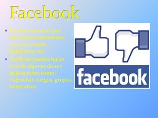 Este documento resume brevemente las características y funciones de varias redes sociales y servicios de comunicación populares como Facebook, Twitter, Gmail, YouTube, Fotolog, Habbo y Quora, describiendo que permiten publicar actualizaciones, fotos, videos, enviar correo electrónico, chatear en línea y hacer preguntas a otros usuarios.