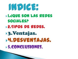 El documento resume los tipos de redes sociales, sus ventajas y desventajas. Explica que las redes sociales más utilizadas son las generales, profesionales, de ocio, de contenidos y geográficas. Luego describe brevemente algunas redes sociales populares como Tuenti, Facebook y Twitter, resaltando sus características clave y fundadores. Finalmente, menciona posibles desventajas del uso excesivo de redes sociales y concluye que deben usarse con moderación.