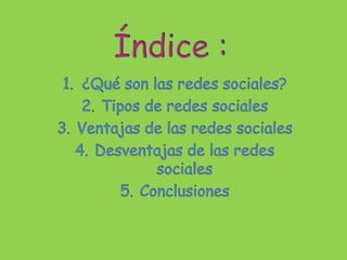 Las redes sociales conectan a personas de todo el mundo a través de Internet. La primera red social se creó en 1995 para que la gente pudiera mantenerse en contacto con antiguos compañeros de clase. En la actualidad existen más de 200 redes sociales populares como Facebook, Twitter y Tuenti. Cada red social tiene sus propias características como publicar actualizaciones cortas en Twitter o compartir fotos con amigos en Facebook.