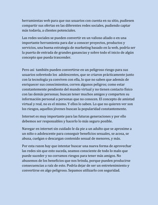 Las redes sociales se han convertido en herramientas importantes para la comunicación y el entretenimiento, pero también pueden tener efectos negativos si no se usan de manera responsable. Algunas de las enfermedades asociadas con el uso excesivo de redes sociales incluyen ansiedad, nomofobia, depresión y adicción a Internet o videojuegos. Los adolescentes son especialmente vulnerables ya que buscan popularidad y aceptación en línea sin considerar los riesgos para su privacidad y seguridad. Se recomienda establecer límites