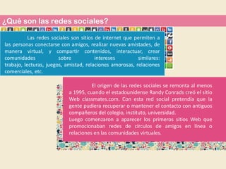 Las redes sociales son sitios web que permiten a las personas conectarse con amigos y hacer nuevas amistades de manera virtual, compartir contenido e interactuar. Se originaron en 1995 para mantener contacto con antiguos compañeros de estudio y han crecido rápidamente en popularidad, permitiendo interacción entre personas aunque no se conozcan personalmente.