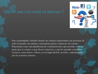 El documento describe las redes sociales, incluyendo que son comunidades virtuales donde los usuarios interactúan con personas de todo el mundo con intereses comunes. Explica que funcionan como plataformas para conectar a la gente y compartir recursos como fotos y videos. También describe algunos riesgos como estafas, falta de privacidad y perfiles falsos. Además, menciona diferentes tipos y ejemplos populares de redes sociales como Facebook, Twitter, LinkedIn y YouTube.
