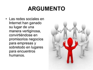 Las redes sociales han emergido rápidamente como espacios de interacción y negocio, permitiendo a las personas conectar en torno a intereses comunes y reducir el aislamiento. Estas plataformas, que incluyen sitios como Facebook y Twitter, fomentan la pluralidad y la comunidad, transformando la identidad de los usuarios a través de la conexión social. La evolución de las redes sociales refleja un cambio hacia la digitalización y el intercambio de información, marcando un impacto significativo en la sociedad contemporánea.