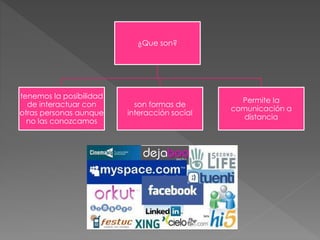 Este documento describe las redes sociales, sus ventajas y desventajas. Las redes sociales como Facebook, WhatsApp y Twitter permiten la comunicación a distancia y facilitan las interacciones sociales aunque no se conozca personalmente a otras personas. Entre las ventajas se encuentran que facilitan las relaciones y el aprendizaje fuera del aula, mientras que entre las desventajas están los robos de identidad, el acoso cibernético y el robo de información personal.