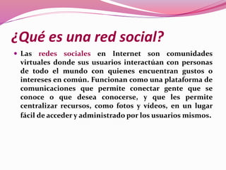Las redes sociales son comunidades virtuales donde los usuarios interactúan con personas de todo el mundo con quienes comparten intereses. Permiten conectar gente que se conoce o desea conocerse y centralizar recursos como fotos y videos. Su historia se remonta a los primeros intentos de comunicación a través de Internet en la década de 1970, pero no fue hasta la década de 2000 que surgieron populares redes sociales como Facebook, Twitter y LinkedIn. Las redes sociales tienen ventajas como mantenerse informado y compartir con otros, pero también desventajas