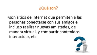 Las redes sociales son sitios web que permiten a las personas conectarse y compartir contenido con amigos de manera virtual. Se originaron en 1995 con el sitio Classmates.com. Ofrecen ventajas como mantener el contacto con conocidos y generar nuevas amistades, pero también riesgos como exponer información personal y volverse adictivas si no se usan con moderación.