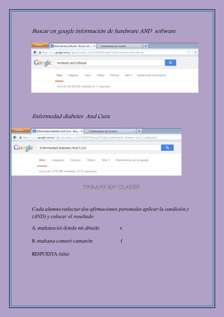 Este documento describe brevemente los operadores lógicos AND, OR y NOT que se usan para realizar búsquedas más específicas en los buscadores. Explica que AND requiere que ambas palabras estén presentes, OR requiere solo una de las palabras, y NOT niega una palabra. También proporciona ejemplos de cómo usar estos operadores lógicos.