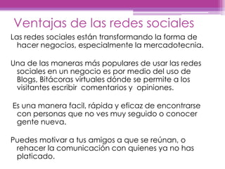 El documento describe las principales ventajas y desventajas de las redes sociales. Entre las ventajas se encuentran que permiten comunicarse con personas que no se ven seguido y conocer nueva gente, además de ser una forma efectiva de hacer negocios y promocionar productos. Algunas desventajas son la pérdida de privacidad al revelar demasiada información personal, la adicción que pueden generar al distraer de otras actividades productivas, y los casos de pedofilia y robo de datos que se han presentado. La conclusión es