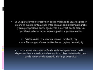 Las redes sociales son plataformas interactivas gratuitas donde los usuarios pueden crear perfiles con información personal e interactuar entre sí. Existen varias redes como Facebook, Twitter y Messenger que permiten publicar fotos y pensamientos, y conectarse con grupos que comparten intereses. Las redes sociales también se usan para comunicarse con familiares en el extranjero y conocer nuevas personas.