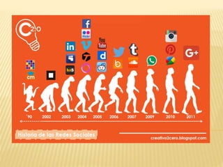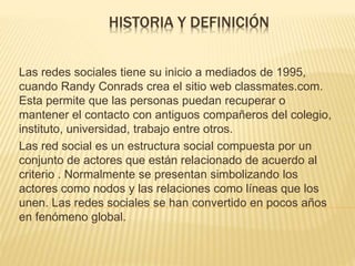 Las redes sociales, iniciadas en 1995 con classmates.com, facilitan el contacto entre personas y se han convertido en un fenómeno global. Existen tipos digitales y no digitales, con ventajas como el intercambio de experiencias y desventajas como la invasión de privacidad. Se utilizan principalmente para interactuar y comunicarse con amigos, familiares y colegas.