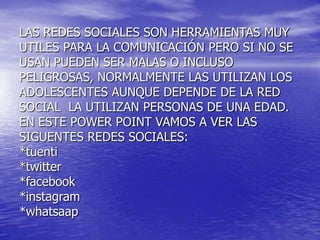 Este documento describe varias redes sociales populares como Tuenti, Facebook, Twitter, Instagram y WhatsApp. Explica brevemente el origen, características y número de usuarios de cada plataforma. Señala que las redes sociales son útiles para la comunicación pero deben usarse con cuidado, especialmente por los adolescentes.