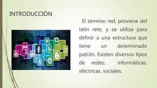 Este documento habla sobre las redes sociales. Explica que las redes sociales comenzaron a mediados de 1995 con el sitio Classmates.com y luego evolucionaron con sitios como Friendster y MySpace a principios de los 2000. También describe algunas ventajas y desventajas del uso de las redes sociales, como facilitar la comunicación pero también plantear riesgos para la privacidad.